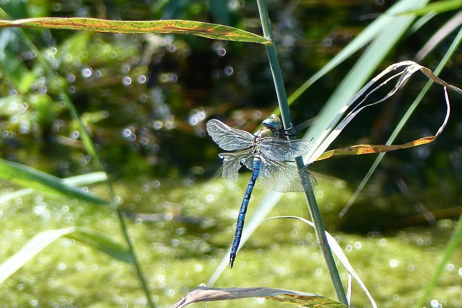 There were three or four male emperor dragonflies patrolling up and down the fleet but only one stopped to catch his breath, and then he only perched for a moment. He's had a tough time: look at his left hind wing.